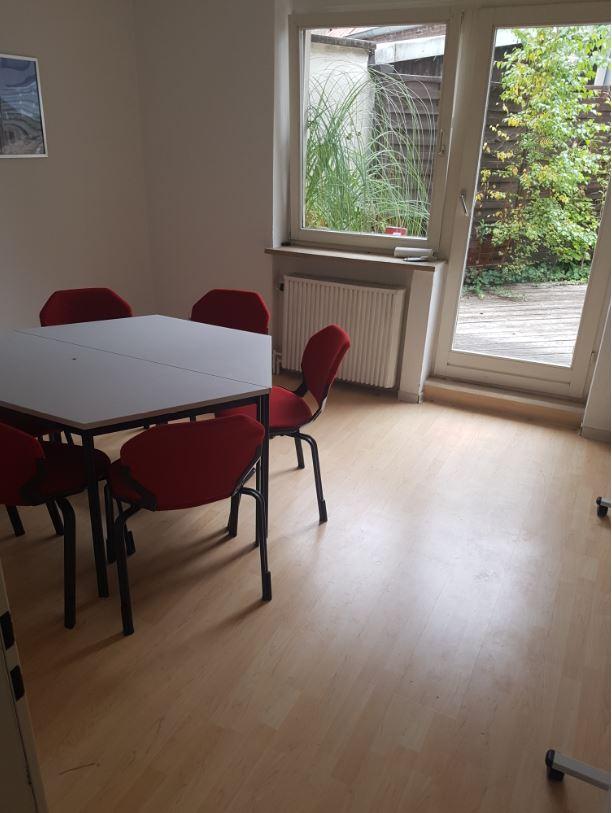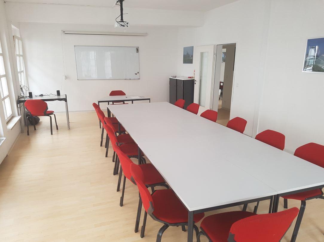 Der einladende helle große Raum bietet u. a. Nutzungsmöglichkeiten als Lehr-, Unterrichts-, Besprechungs- oder Gruppenraum an, auch ein Großraumbüro wäre denkbar. Technisches Unterrichts-Equipment ist aktuell eingerichtet worden.