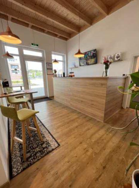 Der Empfangsbereich ist offen und einladend gestaltet. Hier steht Ihnen ein funktionaler Arbeitsbereich mit integrierter Spüle zur Verfügung. Im Eingangsbereich können Ihre Kunden die vorhandenen Sitzgelegenheiten nutzen, um die wunderschöne Aussicht auf den See zu genießen.