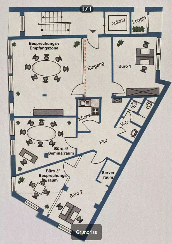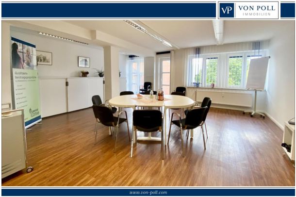 Mit insgesamt vier bis fünf gut geschnittenen Räumen bietet die Büroetage ausreichend Platz für verschiedene Arbeitsbereiche, individuelle Büroräume und Besprechungszonen. Der großzügige Eingangsbereich überzeugt bereits beim Betreten des Objekts. Hier lässt sich ein Bereich abtrennen, der sich hervorragend als Besprechungs- oder Empfangszone eignet und einen flexiblen Empfang Ihrer Kunden oder Mandanten ermöglicht.