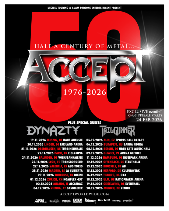 Die neu angekündigten Termine sind Teil der ACCEPT 50th Anniversary Tour und umfassen 24 Headliner-Shows in 11 europäischen Ländern. Im Rahmen der Tour bringt die Band ein halbes Jahrhundert Metal-Geschichte auf die Bühnen Europas und wird Fans in großen Städten in Deutschland, Frankreich, Spanien, Italien, Österreich, der Schweiz, den Niederlanden, Belgien, Polen, Ungarn und der Tschechischen Republik begeistern.