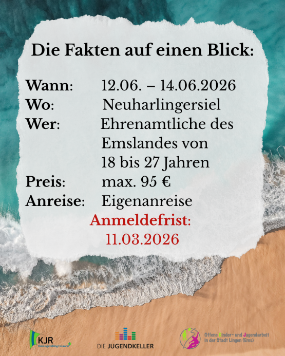 Für Ehrenamtliche aus dem Emsland zwischen 18 und 27 Jahren gibt es dieses Jahr die Möglichkeit vom 12. Juni bis zum 14. Juni ein Wochenende am Meer in Neuharlingersiel zu genießen. Dabei ist egal in welchem Bereich das Ehrenamt ausgeübt wird – das Angebot steht für alle. Die Teilnahmekosten betragen maximal 95 Euro. Die Anreise ist nicht inklusive und muss selbst organisiert werden. Anmeldungen sind bis zum 11. März unter www.lingen.de/auszeit möglich.
