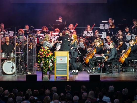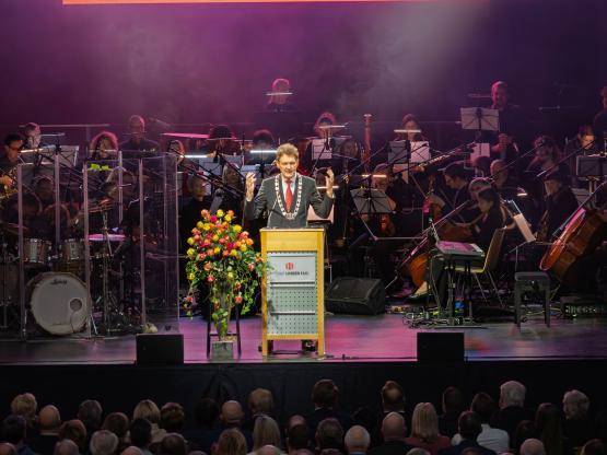 Grüner Wasserstoff, der IT-Campus und die digitale Entwicklung der Stadt, Investitionen in Sicherheit und Infrastruktur sowie die positive Finanzlage: Diese Themen standen im Mittelpunkt der Rede von Oberbürgermeister Dieter Krone beim Bürgerempfang der Stadt Lingen (Ems) in der EmslandArena. Über 2.000 Gäste begrüßte das Stadtoberhaupt am Sonntag. Musikalisch begleitet wurde der Empfang von RoMeO – Rock meets Orchestra – der Musikschule des Emslandes unter der Leitung von Musikdirektor Martin Nieswandt.