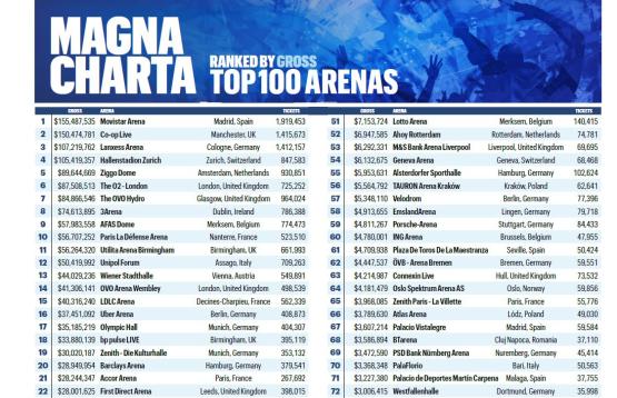 Damit wurde das letztjährige Top-Programm mit Künstlern wie Bob Dylan, Kraftwerk, Dropkick Murphys oder ZAZ international entsprechend gewürdigt. Im deutschlandweiten Arena-Vergleich belegen wir damit einen sensationellen 16. Rang. Angeführt wird die Rangliste der europäischen Top-Arenen von der Movistar Arena in Madrid. Als bestplatzierte Konzerthalle Deutschlands ist die Kölner Lanxess Arena auf Platz 3 geführt.