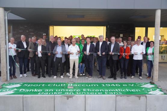 „Das Engagement des Vereins ist beispielhaft“, sagte der stellvertretende Landrat Klaus Prekel. Auch Michael Koop vom Kreissportbund lobte den Einsatz des SC Baccum, der mit der neuen Anlage die Bedingungen für den Breitensport erheblich verbessert habe. Frank Kumbrink und Michael Moss von Moss & Kumbrink Bauplanung übergaben abschließend einen symbolischen Schlüssel zu dem neuen Gebäude. Neben Vertreterinnen und Vertretern der Stadt und des Sports nahmen auch zahlreiche Wegbegleiter und Partner an der Feier teil – darunter die ehemaligen Ortsbürgermeister Bernhard Löpker und Heiner Schomaker, Vertreter der beteiligten Bauunternehmen, Sponsoren sowie Vertreter der Kirche.