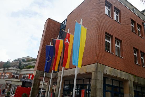 Am 24. Februar jährt sich der Beginn des russischen Angriffskrieges gegen die Ukraine zum vierten Mal. Aus diesem Anlass setzt die Stadt Lingen (Ems) bereits heute (23. Februar) ein sichtbares Zeichen der Solidarität: Vor dem Neuen Rathaus sind die Flaggen gehisst. Damit erinnert die Stadt an die Opfer des Krieges und bekundet ihre anhaltende Verbundenheit mit der ukrainischen Bevölkerung – insbesondere mit Lingens Partnerstadt Lanivtsi.