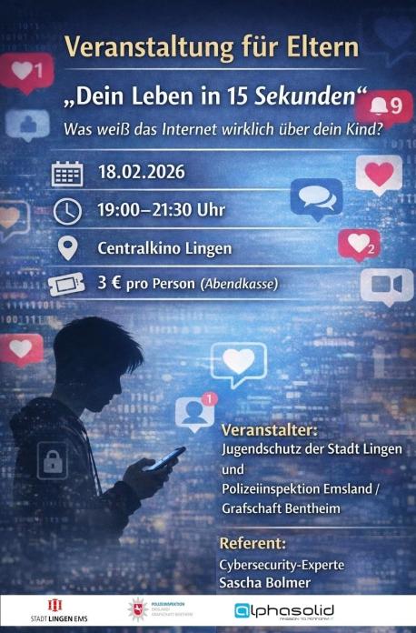 Betrugsversuche, Fake-Profile und Hacker gehören zum Internet dazu – und das betrifft auch Kinder. Deshalb hält Sascha Bolmer am 18. Februar um 19 Uhr einen Vortrag im Centralkino Lingen. Der Vortrag „Dein Leben in 15 Sekunden – was weiß das Internet wirklich über dein Kind?“ hat das Ziel, Eltern für die digitale Lebenswelt ihrer Kinder zu sensibilisieren und präventiv zu stärken. Tickets kosten drei Euro und können an der Abendkasse erworben werden. Das Angebot richtet sich an Eltern, Sorgeberechtigte und alle Interessierten, die mehr über das Thema Cybersecurity erfahren möchten. Im Rahmen der Präventionsarbeit ist der Jugendschutz der Stadt Lingen (Ems) und die Polizeiinspektion Emsland/Grafschaft Bentheim Veranstalter dieses Events.