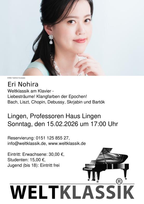 Mit einem Programm von Bach über Debussy kommt die Pianistin Eri Nohira nach Lingen. Sie gibt am Sonntag den 15. Februar um 17 Uhr ein Konzert im Professoren Haus Lingen. Kinder und Jugendliche bis 18 Jahre können das Konzert kostenfrei besuchen. Die Karten für Erwachsene kosten 30 Euro. Reservierungen sind unter 0151 125 855 27, info@weltklassik.de oder www.weltklassik.de möglich.