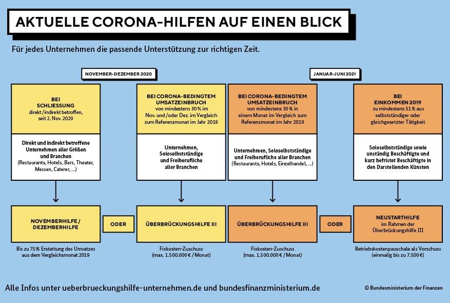 Ab sofort können Zuschüsse aus dem Programm Überbrückungshilfe III beantragt werden. Antragsberechtigt sind dabei Unternehmen, Soloselbstständige und Freiberufler bis maximal 750 Millionen Euro Jahresumsatz sowie gemeinnützige Unternehmen und Organisationen, die im betreffenden Antragsmonat einen Umsatzeinbruch von mindestens 30 Prozent im Vergleich zum Referenzmonat im Jahr 2019 erlitten haben. Der Förderzeitraum umfasst die Monate November 2020 bis Juni 2021. Erstattet werden die betrieblichen Fixkosten gemäß Musterkatalog. Die Zuschusshöhe orientiert sich grundsätzlich am Rückgang des Umsatzes im Vergleich zum entsprechenden Monat des Jahres 2019 und ist wie folgt gestaffelt:
