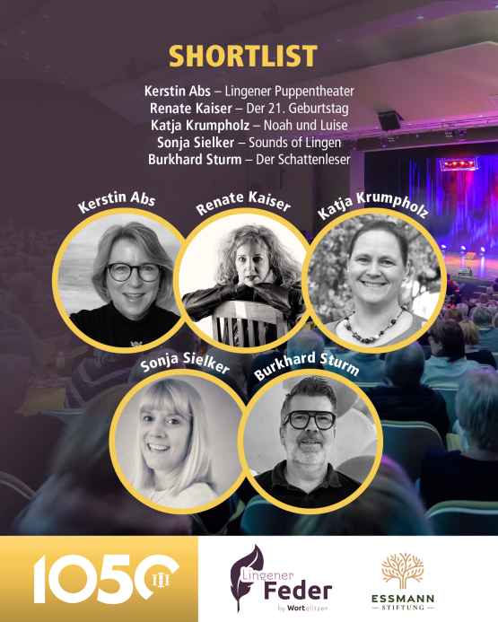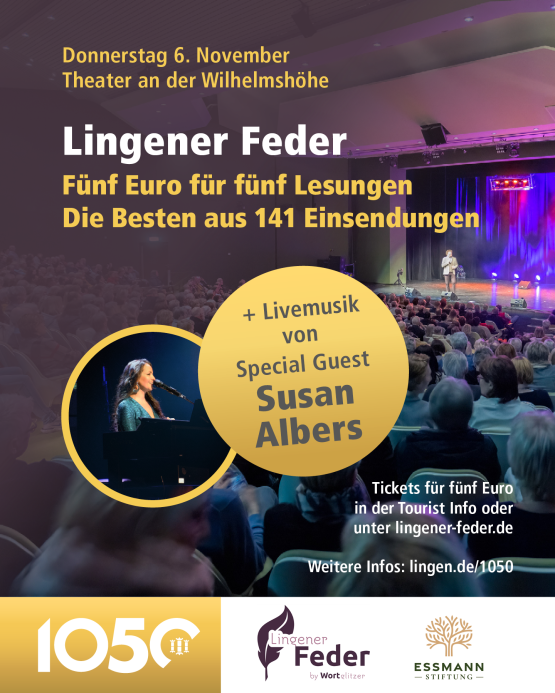 Nach über 140 Einsendungen, drei spannenden Lesungsabenden und hunderten Stimmen aus dem Publikum steht nun das große Finale des Literaturwettbewerbs „Lingener Feder“ bevor. Im Rahmen des Stadtjubiläums wurde der Wettbewerb gemeinsam von der Stadt Lingen mit der Agentur Wortglitzer von Andrea Thal initiiert und von der Essmann Stiftung unterstützt. Am Donnerstag, 6. November, verwandelt sich das Theater an der Wilhelmshöhe in eine Bühne für die besten Geschichten des Jahres – mitreißend, humorvoll, berührend.