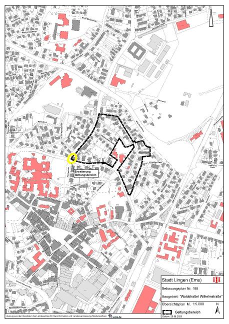 Der Verwaltungsausschuss der Stadt Lingen (Ems) hat in seiner Sitzung am 16.09.2025 die geringfügige Erweiterung des Geltungsbereiches sowie die erneute Offenlage des genannten geänderten Entwurfes des Bebauungsplanes mit Begründung beschlossen. Es wird nach § 13 Abs. 3 BauGB darauf hingewiesen, dass der Bebauungsplan im beschleunigten Verfahren ohne Umweltprüfung aufgestellt wird.